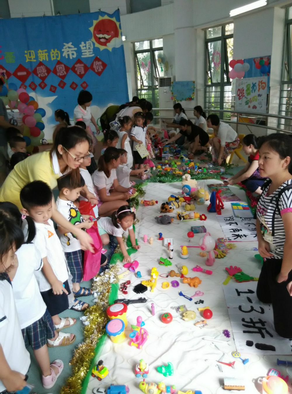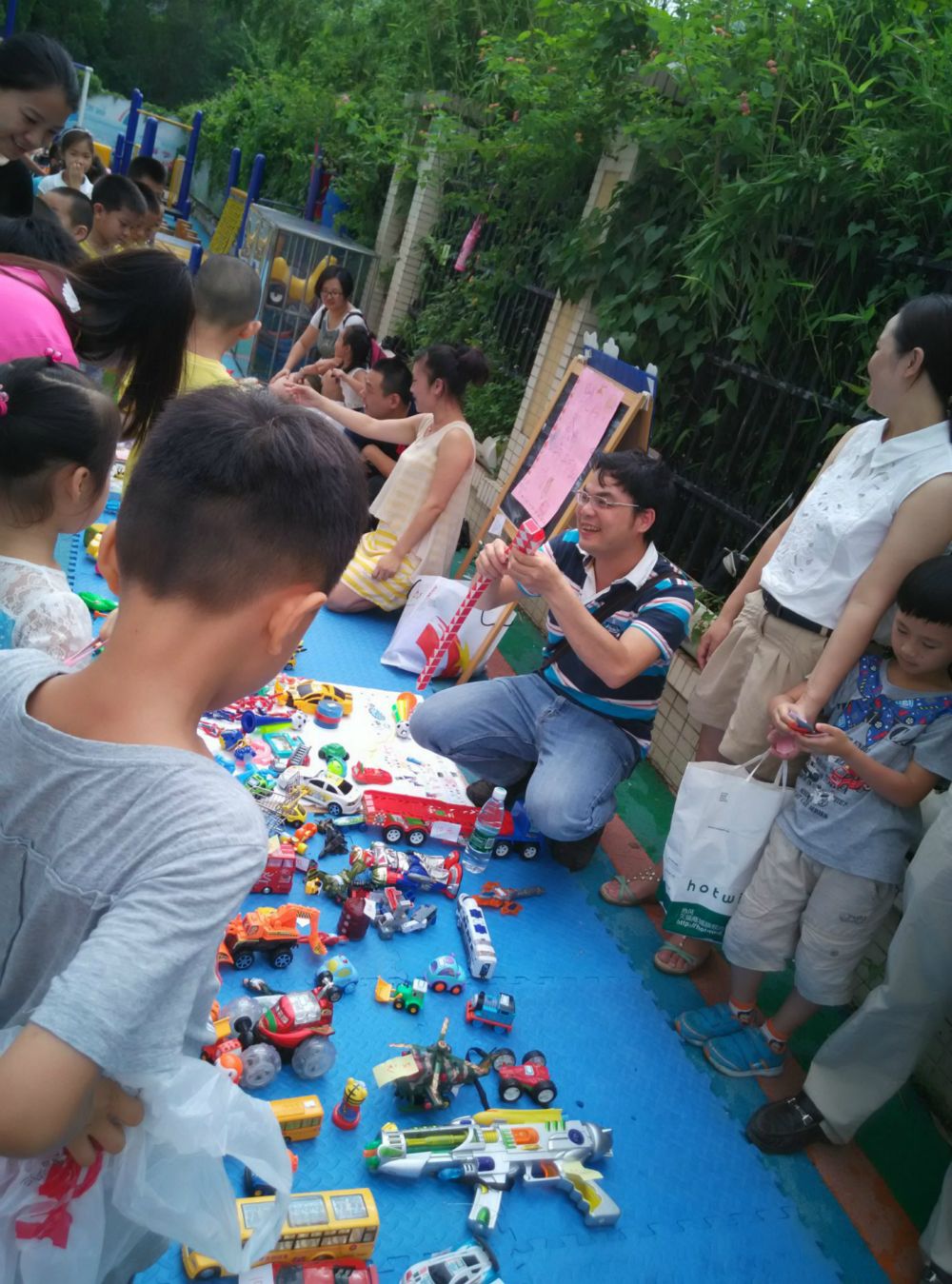 这次的六一活动,我们根据每个班级报名参加摆摊位的家长义工来分布摊位,每个班分有三个大摊位,每个班邀请10名家长义工,其中三位家长参加摆摊位活动,其她剩下的家长负责带领班级的幼儿参加逛市场、够物活动。