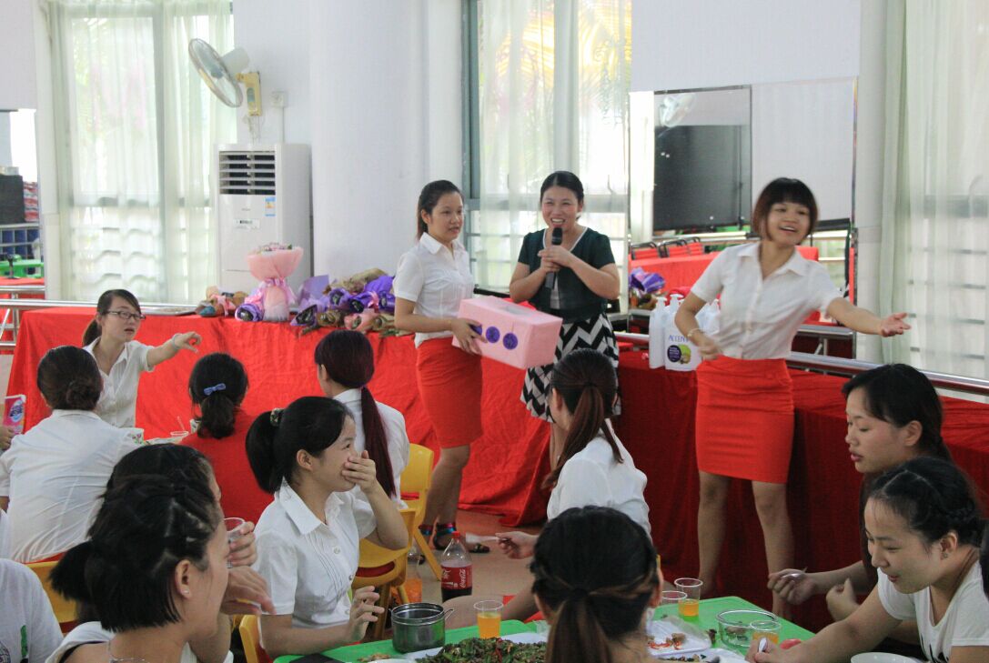 三、全体教师在园聚餐。 为了丰富老师们的生活,我园特地安排的一些精彩的节目给大家欣赏。首先是大班组带来的动感爵士舞,接着是一个精彩的朗诵,随之而来的是中班组的印度舞,场面十分精彩。一片呐喊声。最后是我们的小班组的健美操,十分活泼充满了无限活力。这些精彩节目充分展示了我们幼儿园的多才多艺的教师风采。