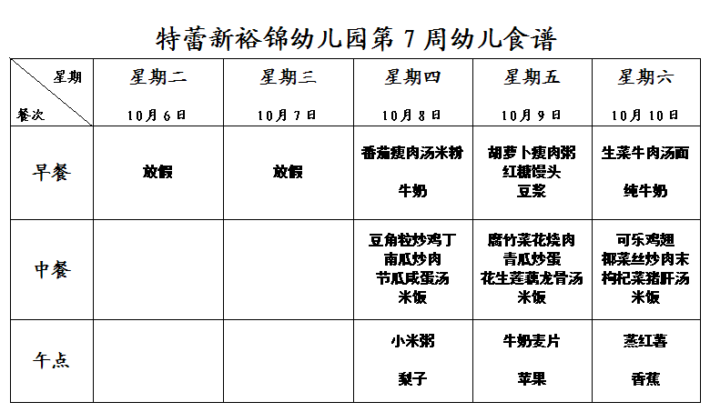 特蕾新裕锦幼儿园第七周幼儿食谱