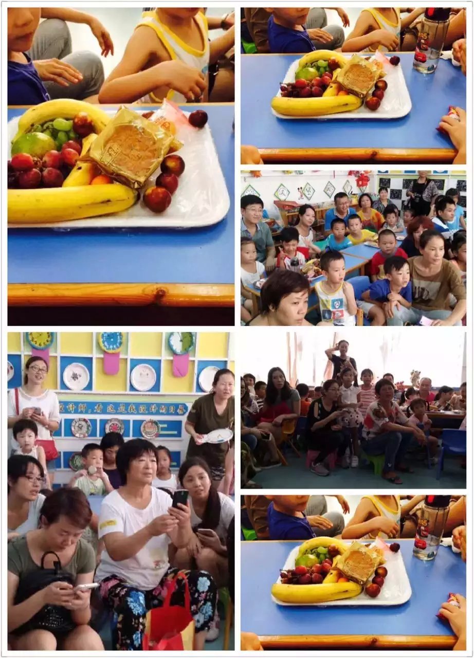 教师把准备好的美食端上桌子,拿出一个大月饼象征着我们一家人,中秋团圆吃月饼,每个小朋友和家长都要吃上那么一口才算圆满。