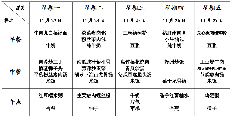 特蕾新裕锦幼儿园第十四周幼儿食谱