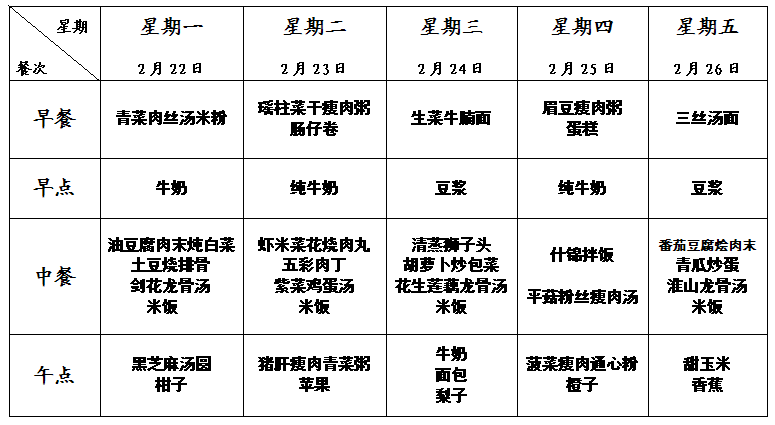 特蕾新裕锦幼儿园第二周幼儿食谱