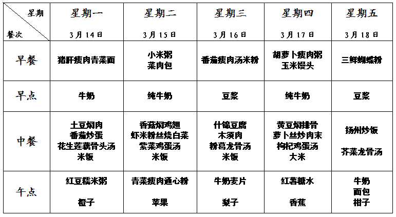 特蕾新裕锦幼儿园第五周幼儿食谱