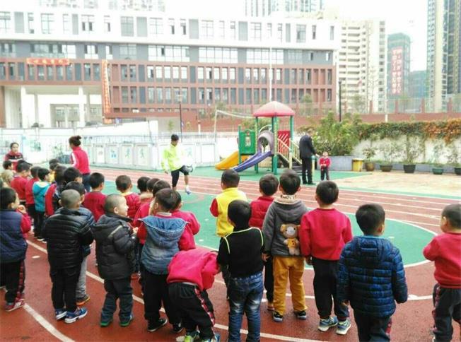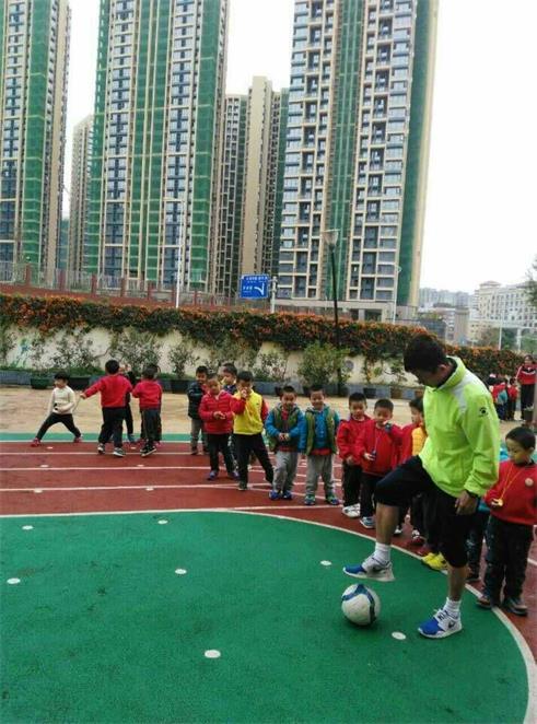 一个阳光明媚的上午,一群男孩子们高高兴兴地走到幼儿园上操场,准备好好的学习怎么踢足球。 那位头发乌黑的足球教练正聚精会神地盯着足球,一脚一个球的踢着。 站在他身后的小男孩们,穿着红色的运动服,挺着肚子,津津有味的看的入迷。