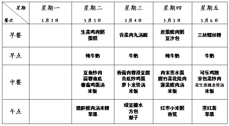 特蕾新裕锦幼儿园第十二周幼儿食谱