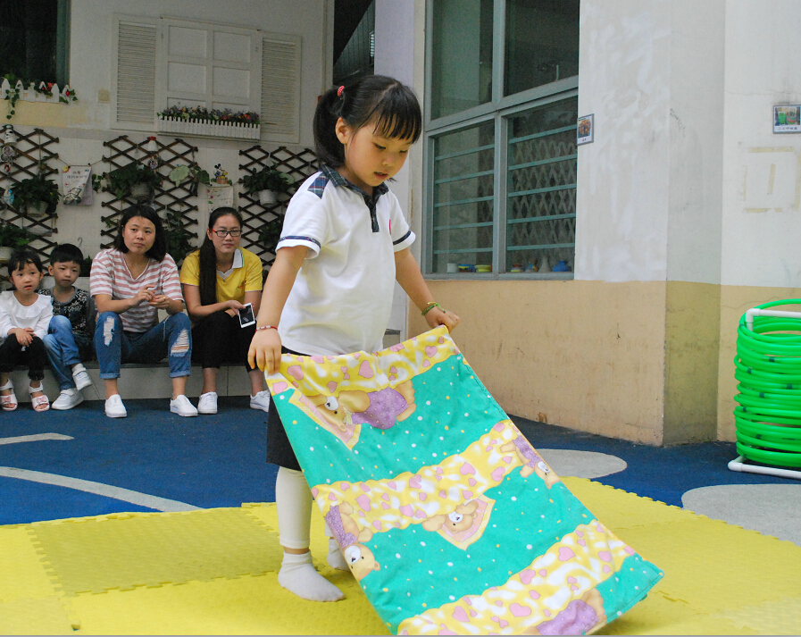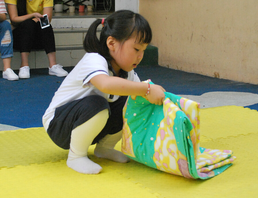比赛前,教师先介绍比赛的规则和注意事项,同时还邀请了一位小朋友来给大家做正确的示范,然后紧接着谢老师一声令下,比赛开始啦!只见孩子们各就各位。按 照分好的小组有序并迅速的整理起自己的被子,小手不停的摆弄着,有的两个小朋友一起合作,动作娴熟,一气呵成。不一会儿,“豆腐块”状的被子就成形了,孩 子们看着自己的劳动成果,体会到了成功的快乐,真是有趣而富有意义。作为老师,我们也感到无比欣慰,孩子们长大了,能够体验到生活自理的乐趣了。