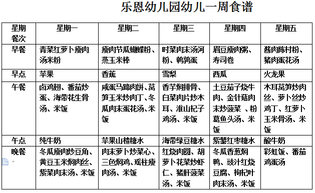 乐恩幼儿园2016.5.16-5.20一周食谱