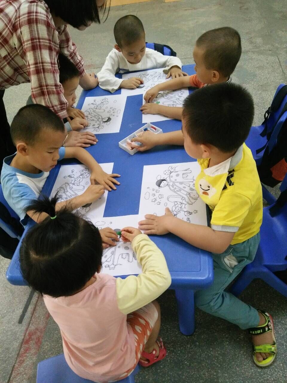 小班的小朋友从认识颜色活动到涂色活动,慢慢地在进步。你看!老师都在表扬小朋友呢!