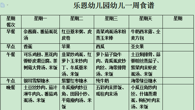 乐恩幼儿园2016.6.6-6.8-6.12一周食谱
