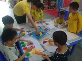 亲切可亲的老师正在指导我们的孩子们如何用玩具拼出更好看更有创意的美术画。