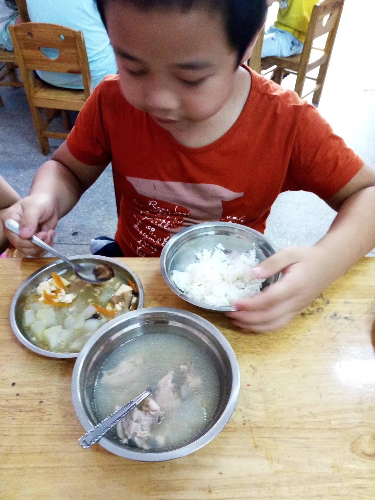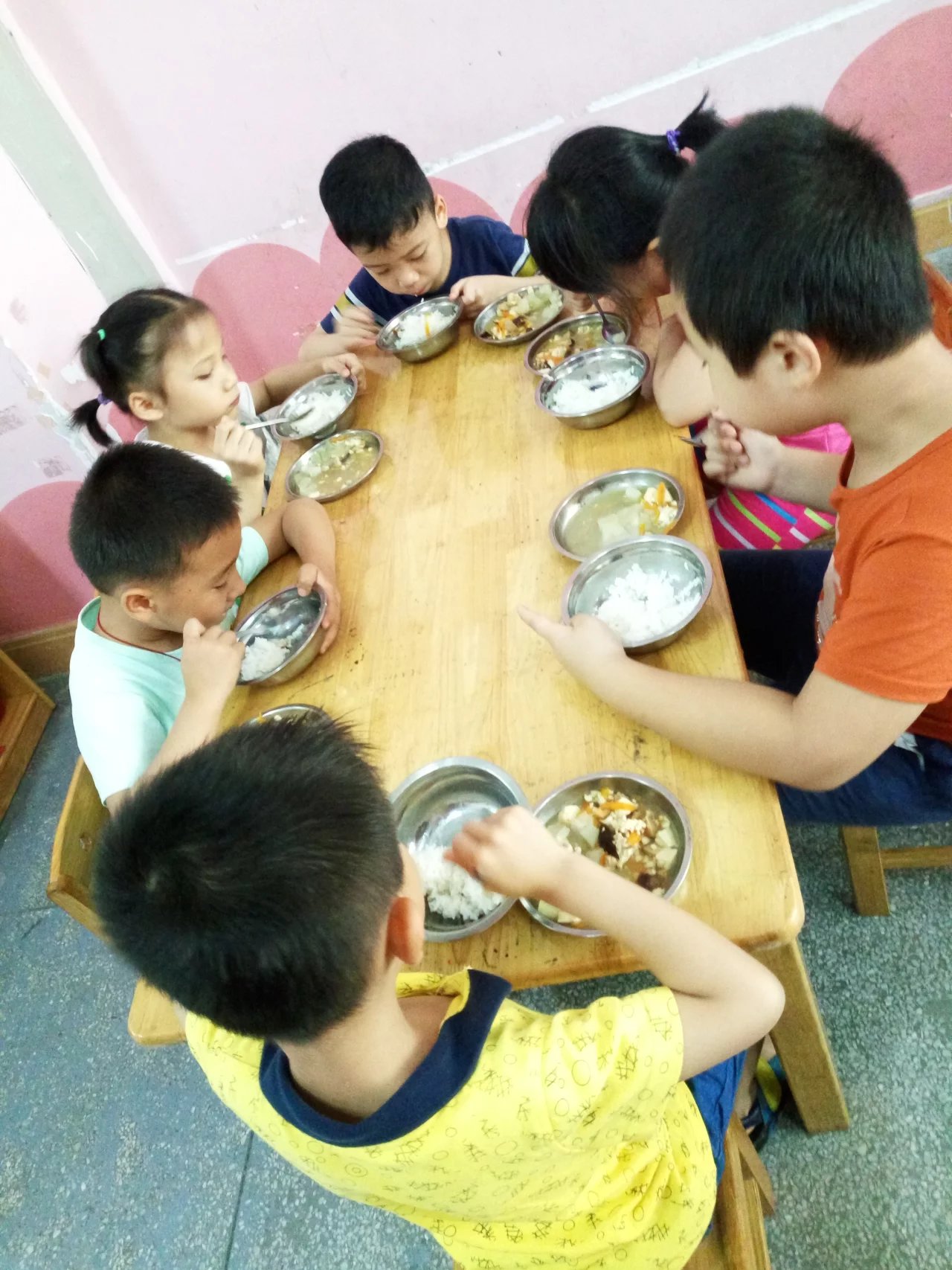 叮咚。。。。。午餐时间到咯!宝源幼儿园的孩子们正在吃午饭哦!你瞧!一口饭一口菜不挑食也不掉饭粒。真棒!