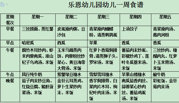 乐恩幼儿园2016.6.13-6.17一周食谱