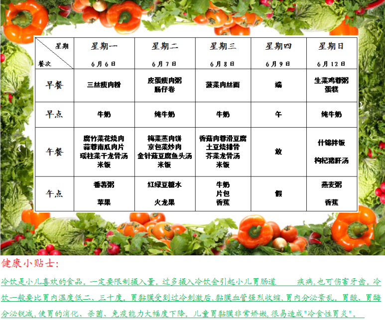特蕾新裕锦幼儿园第十七周幼儿食谱