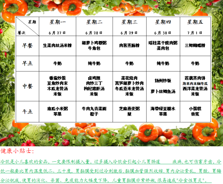 特蕾新裕锦幼儿园第二十周幼儿食谱