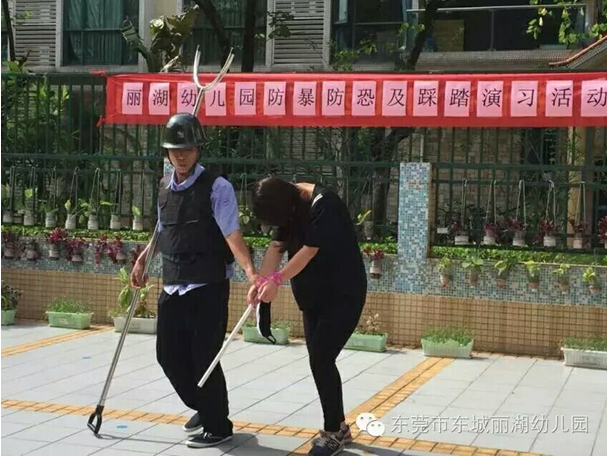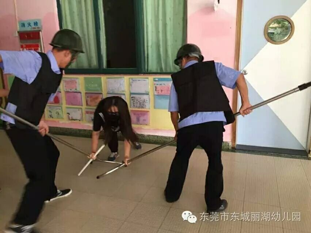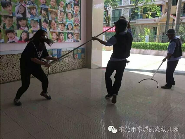 幼儿园应急小队紧急行动,按防暴应急预案手持棍棒、钢叉等,将“歹徒”围住,临危