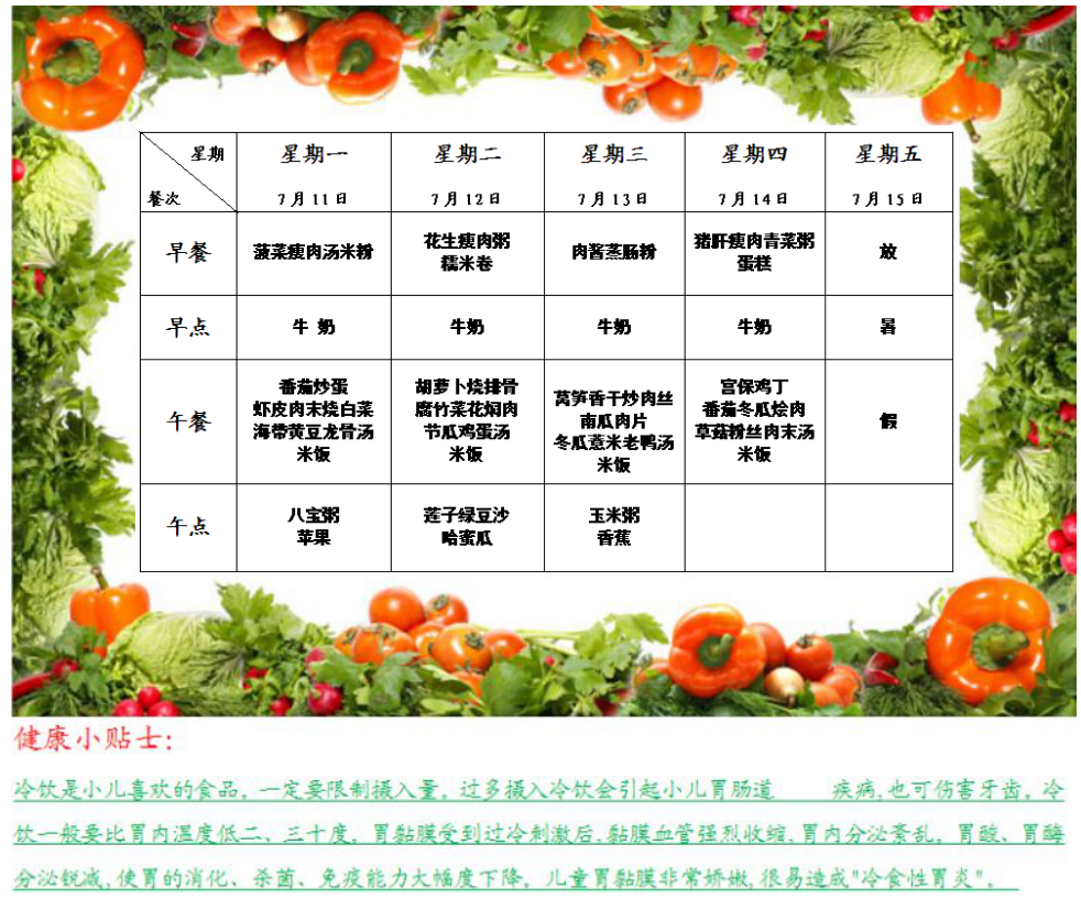 特蕾新裕锦幼儿园第二十二周幼儿食谱
