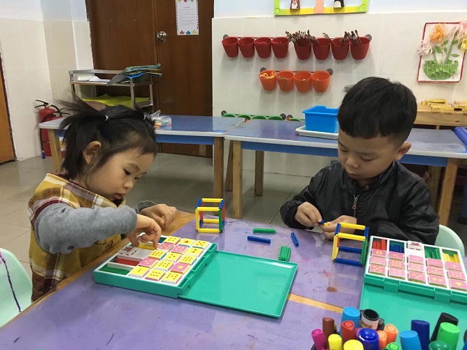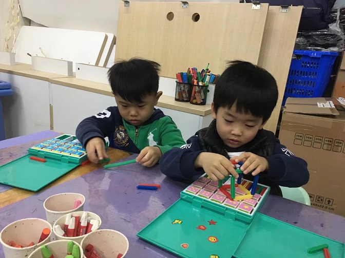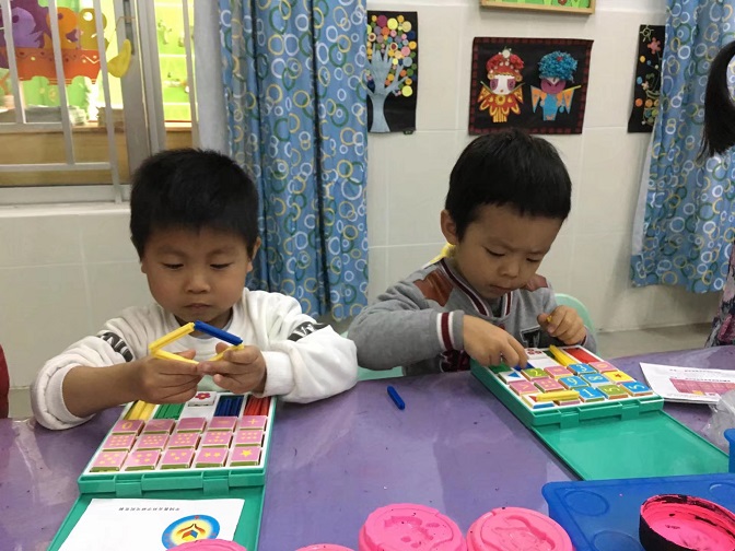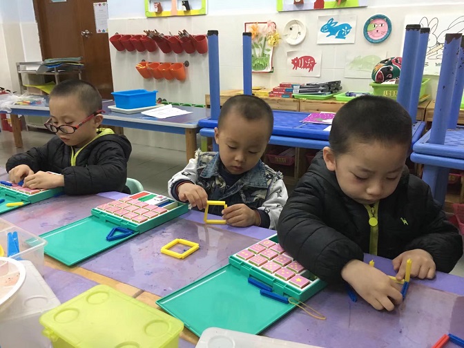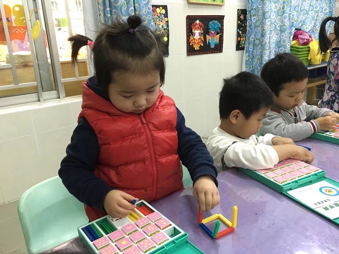 2、幼儿动手拼插正方形。