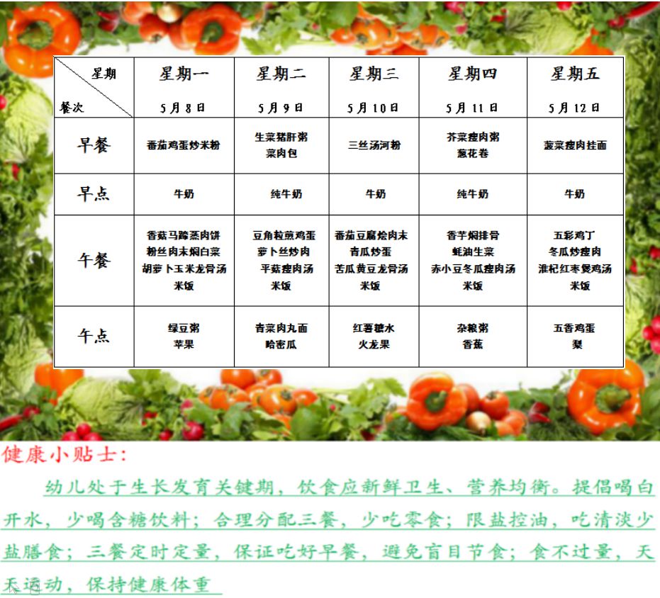 特蕾新裕锦幼儿园第十四周幼儿食谱