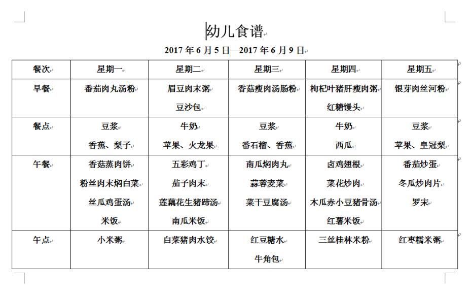 【特蕾新东城丽湖幼儿园每周食谱2017年6月5日—2017年6月9日】