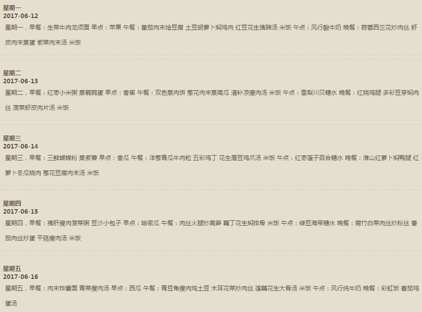 乐恩幼儿园2017.6.12-6.16一周食谱