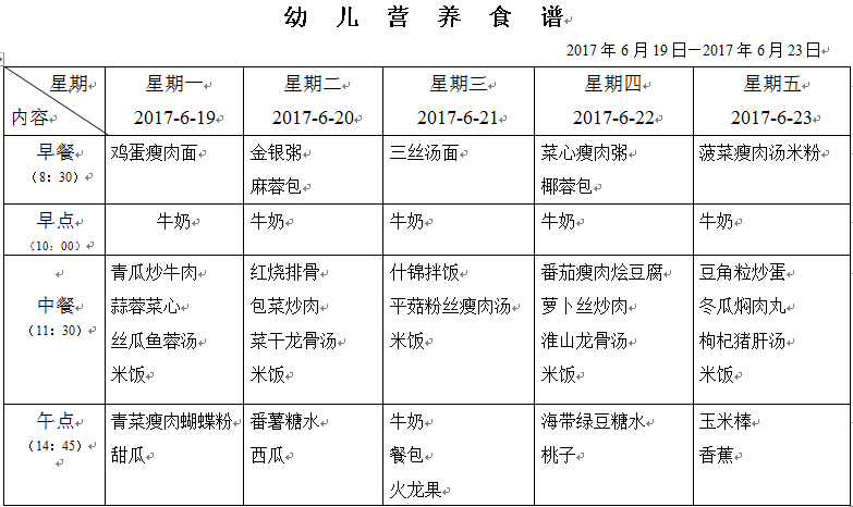 2016-2017第二学期幼儿第十九周营养食谱(6.19—6.23)