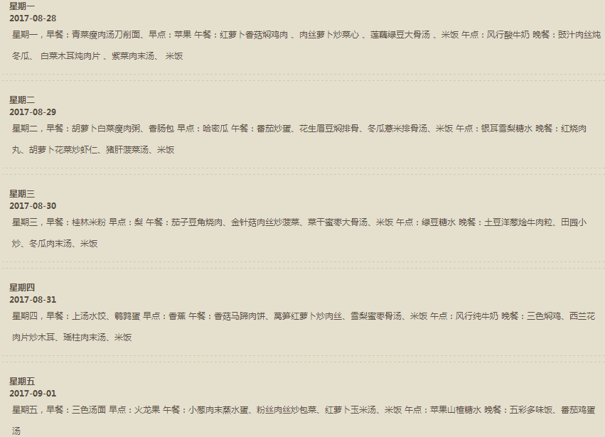 乐恩幼儿园2017.8.28-9.1一周食谱