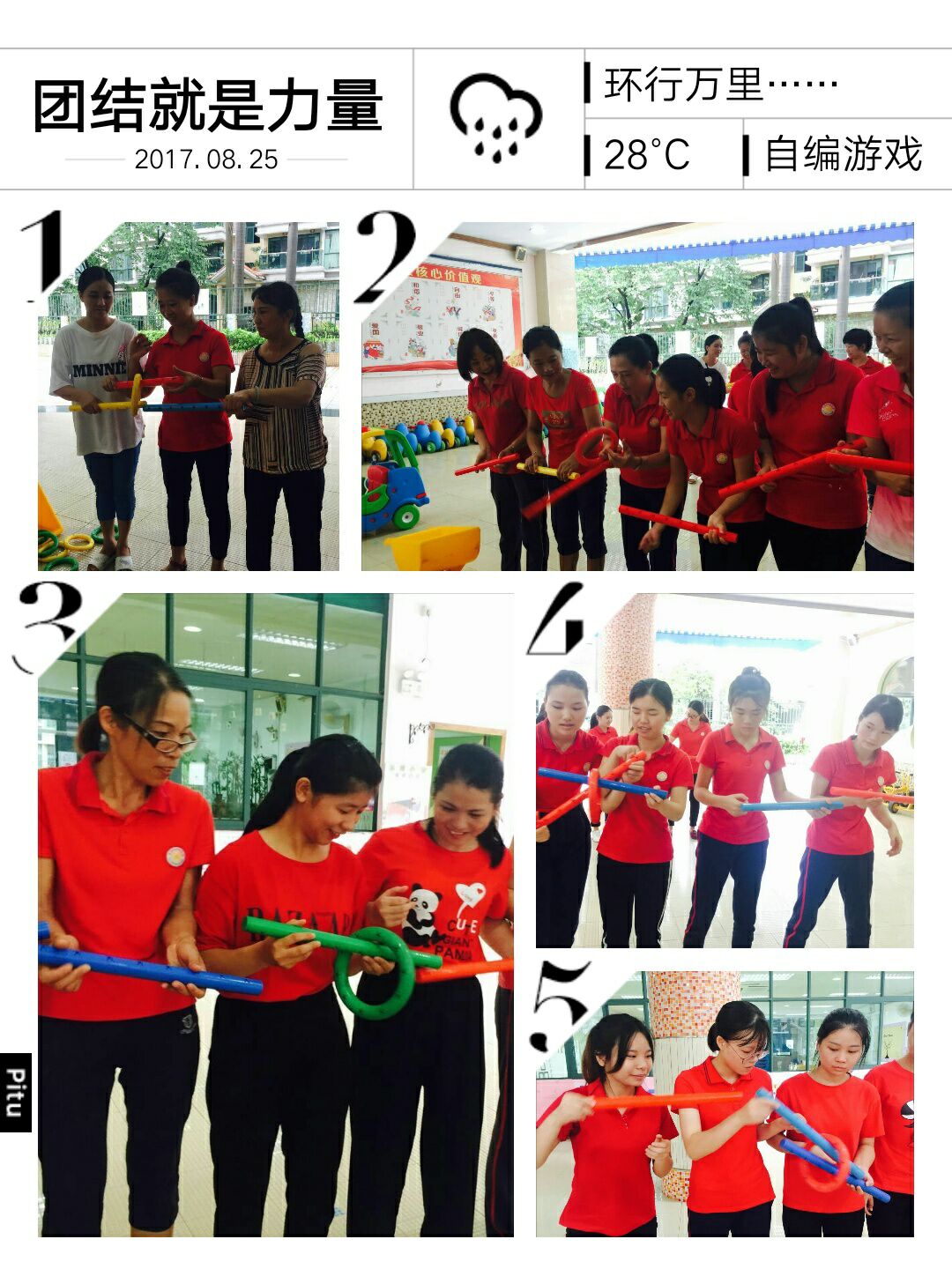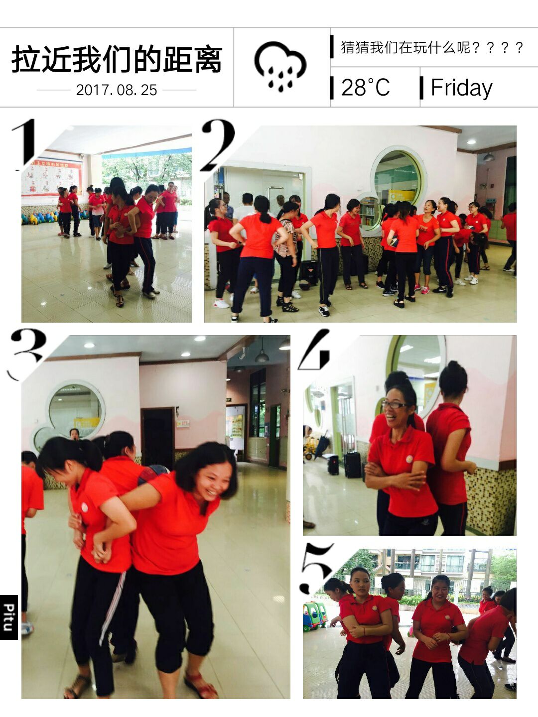 新学期开始啦!为了调动全体教职工的工作热情,激发教职工的工作干劲,调节教师身心健康,进一步增强幼儿园的凝聚力,增加教师的归属感和幸福感,提高教师之间的协作精神和集体主义精神,营造和谐幸福校园。2017年8月25日下午,组织全园教职工“拉近我们的距离”拓展活动。