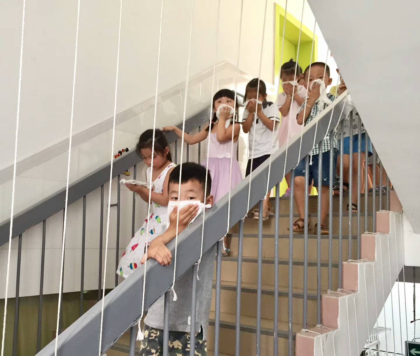 演习活动前,教师针对幼儿火场逃生、救援疏散等事项,精心设计了消防演习方案,并就每个楼层、教室的分布,规定相应的逃生路线。以及火灾发生时应该注意的事项进行了说明。上午9点40分,消防演习正式开始,幼儿园里响起了紧急集合的报警声。只见小朋友们在老师的指导下,双手捂着口鼻、弯下身体有序地按规定的路线冷静、快速的疏散到集合地点。
