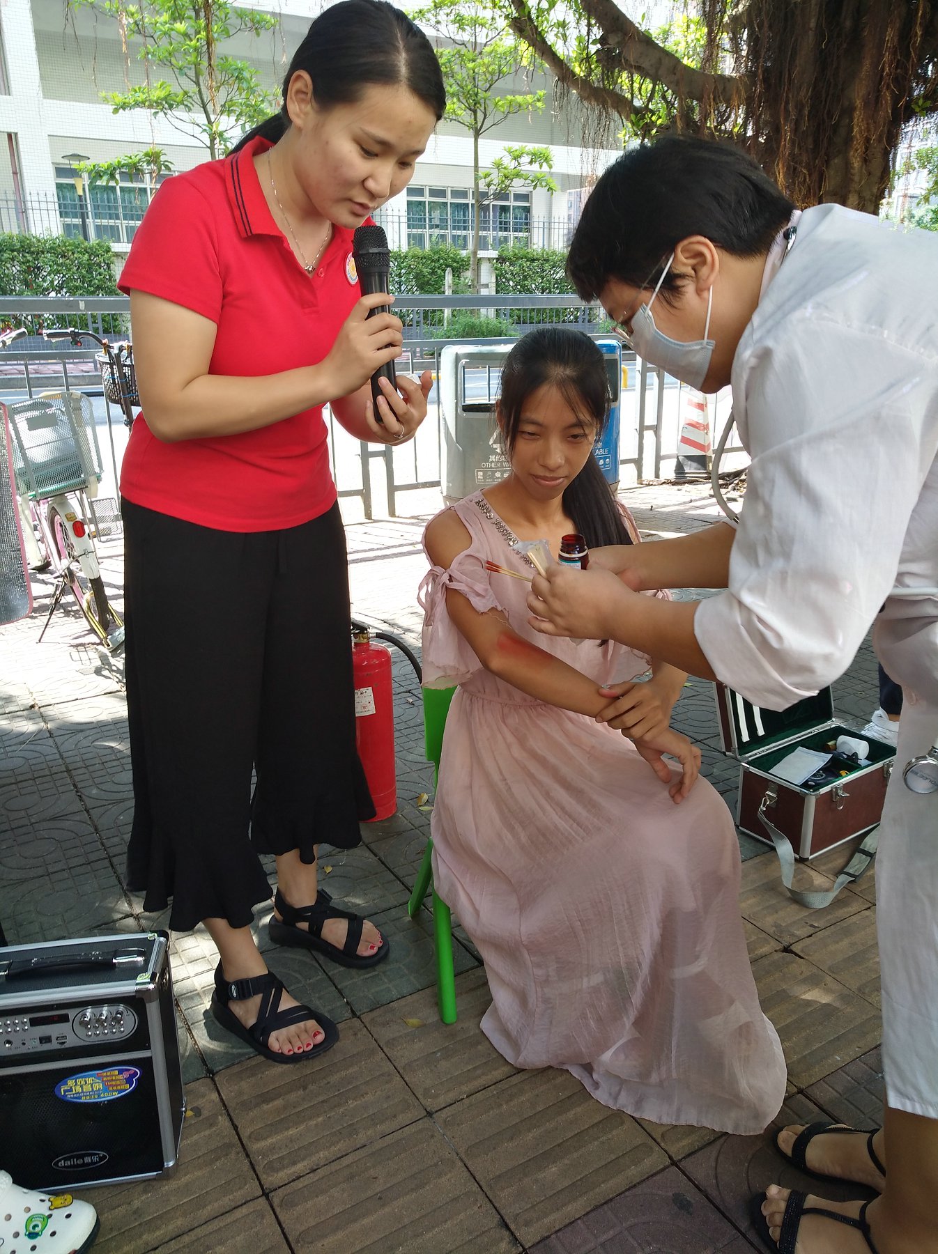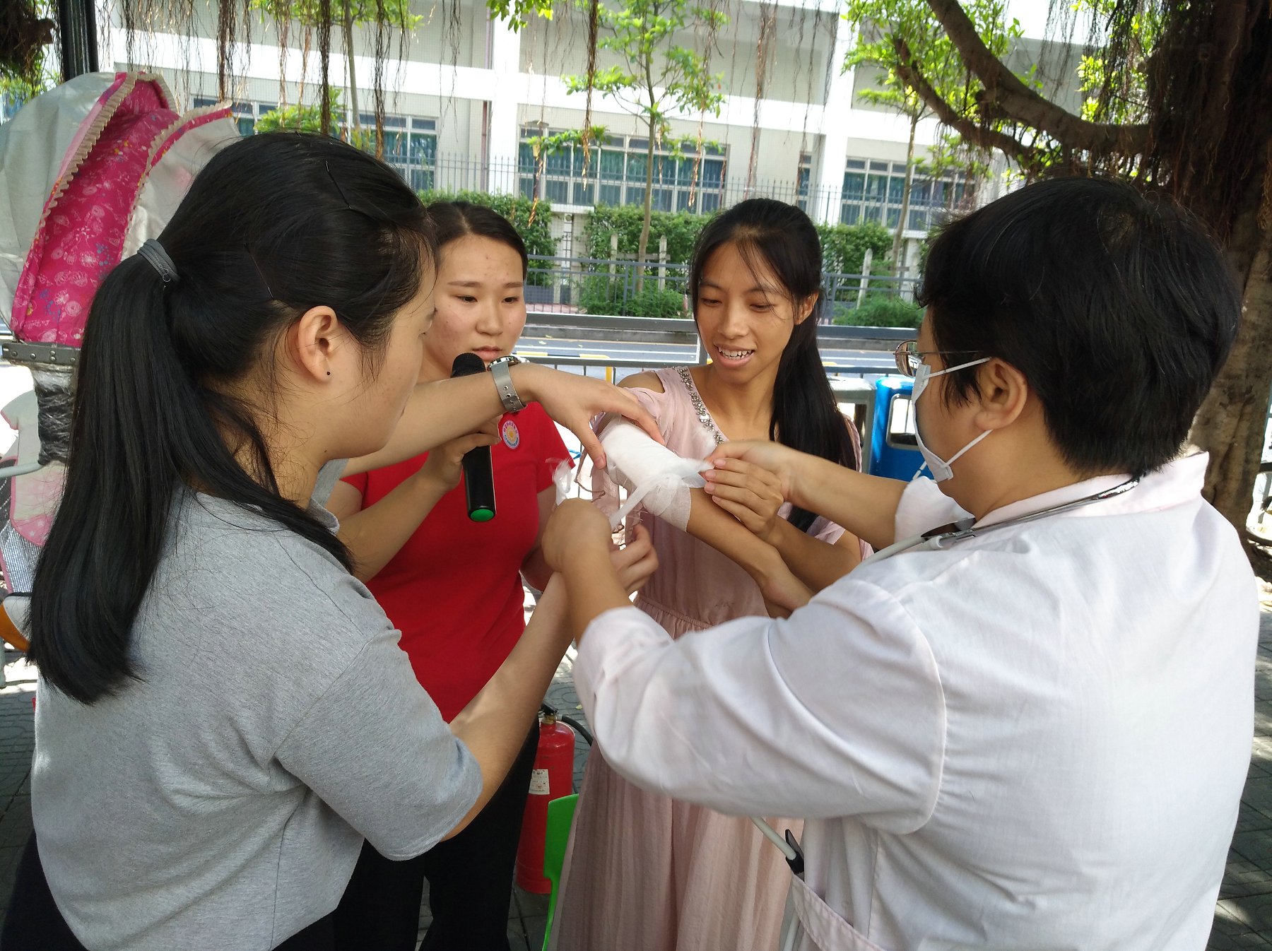 逃生过程中骆老师不小心摔伤了,医生演示受伤了应该怎么办?