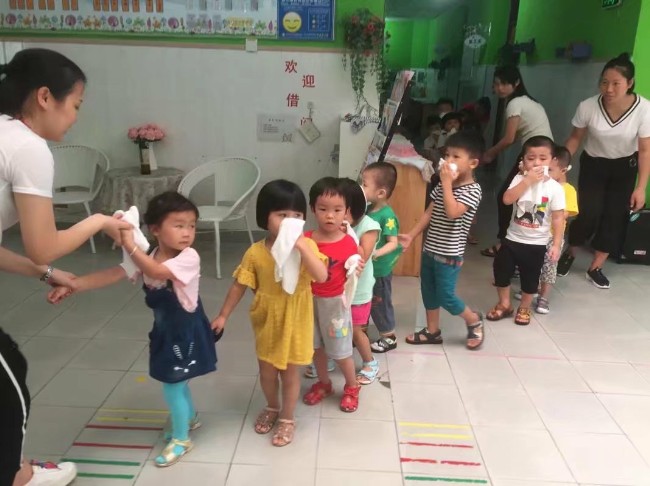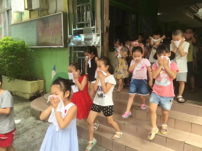 演练前教师先进行了消防知识的教学活动,接着进行了消防演习,随着急促的口哨声响起,全园幼儿在教师的带领下,迅速用湿毛巾捂住口鼻,弯腰伏身,快速而有序地按预定疏散路线,从“火场”逃离,疏散到幼儿园的操场上。全园教工分工明确,各行其责,整个活动井然有序,约3分钟后,全体师幼都已安全的撤离到了室外空旷的安全地带。