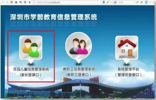 一、进入网站 登录市教育行政部门的门户网站,选择“深圳市学前教育信息管理系统”,点击进入“在园儿童信息管理系统”;或直接输入网址: http://ertong.sz.edu.cn/,进入“深圳市学前教育信息管理系统”,点击“在园儿童信息管理系统”,选择家长登录口。(PS建议使用最新的谷歌浏览器或者360浏览器进行操作)