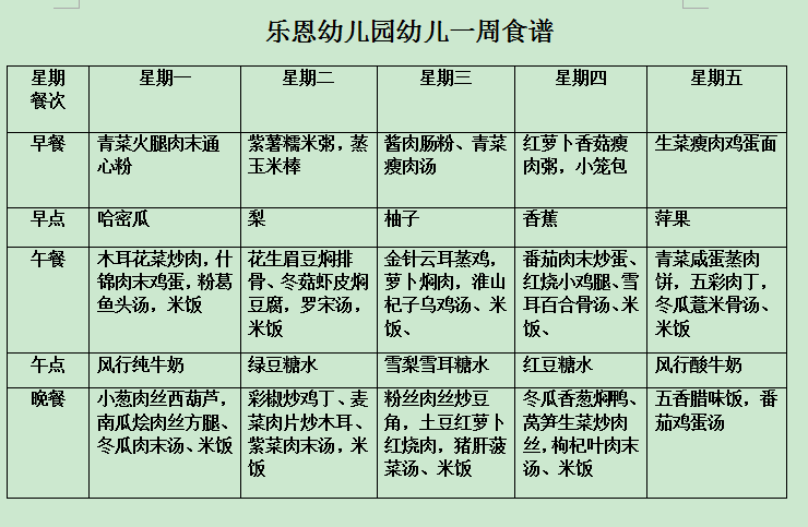乐恩幼儿园2017.10.9-10.13一周食谱