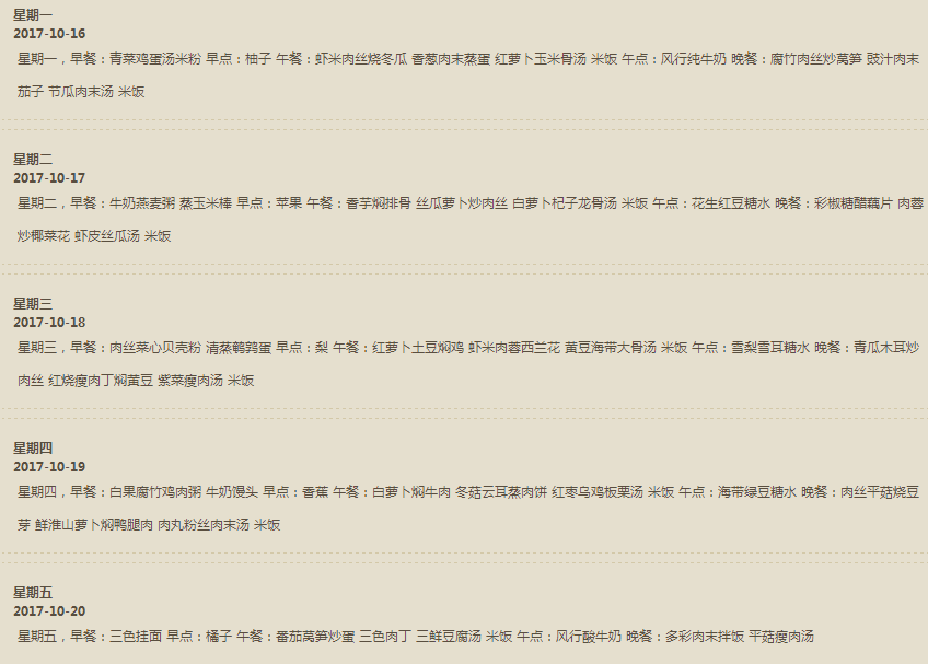 乐恩幼儿园2017.10.16-10.20一周食谱