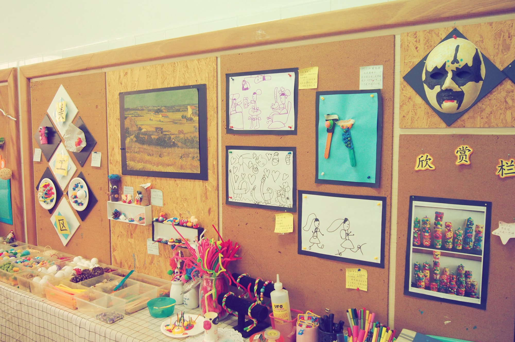 整个环境布置丰富有内涵:户外场地宽广,各种设施丰富有层次,在场地边上摆放着各种活动器械,合理地利用了户外游戏场地。楼道走廊呈现的是孩子们的美术作品和养殖种植观察记录,一路走来感觉上了一节美术创意课和科普活动课。室内环境的所有内容都是来自孩子,真正体现了以幼儿为本。