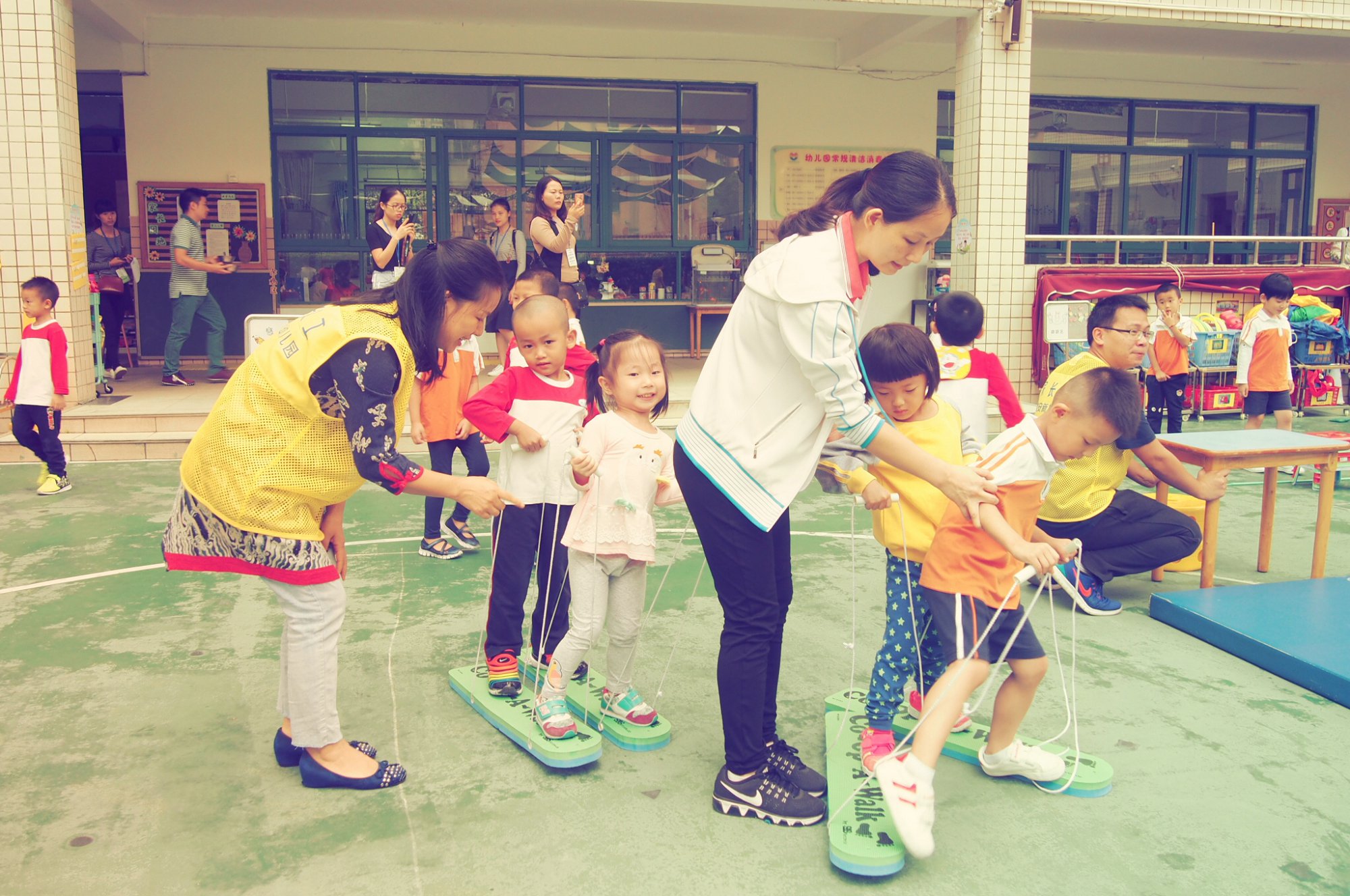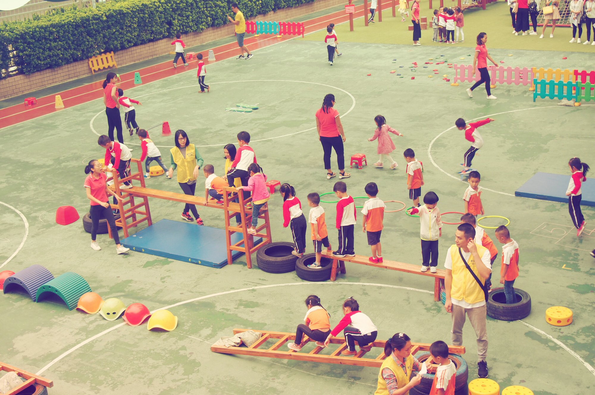 户外活动丰富多彩:分别有跳跃区、钻爬区、平衡区、小组合作区、投掷区、快跑区和大型玩具区。活动开始,整个操场都沸腾了,过程中,孩子们的热情高涨,参与度达到了90%以上。整个活动紧紧围绕指南的目标来开展,可以看出老师们的专业水平是相当之高。