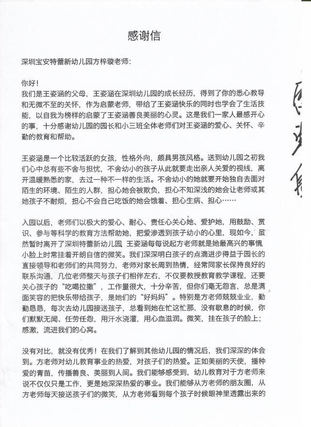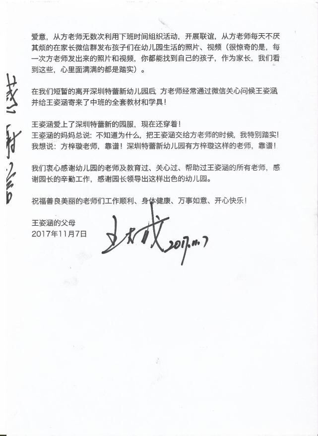 11月8日,我园王姿涵小朋友的父母为感谢幼儿园方老师及幼儿园对王姿涵小朋友的悉心教导,送来一封感谢信,并在 “天天快报” 进行了刊登,信中家长朋友不禁发出了“方梓璇老师,靠谱!特蕾新幼儿园有方梓璇这样的老师,靠谱”的感叹。