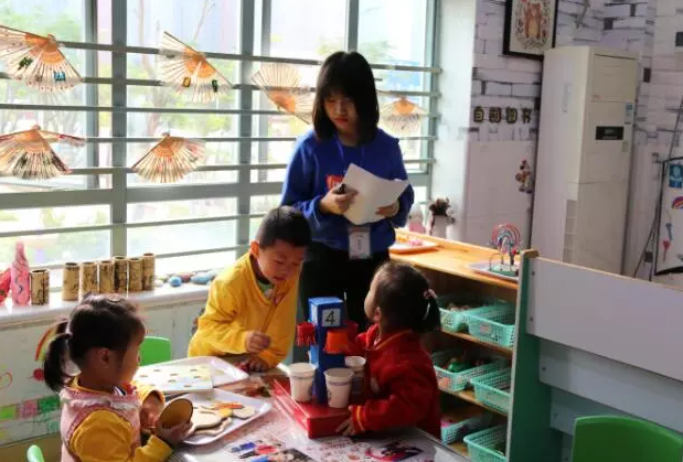 晨谈过后就是孩子们最喜欢的区域自选活动了,十几个游戏区供孩子们选择。一个班主任讲到:每个区都有不一样的材料,不一样的玩法,不一样的精彩。区域活动也是老师们最关心、疑惑最多的环节。观摩的老师们与孩子亲切交谈,询问他们的工作;观察和谈论老师的分工;查看区域材料,找寻孩子的痕迹。老师们专注认真的样子让人感动和钦佩。