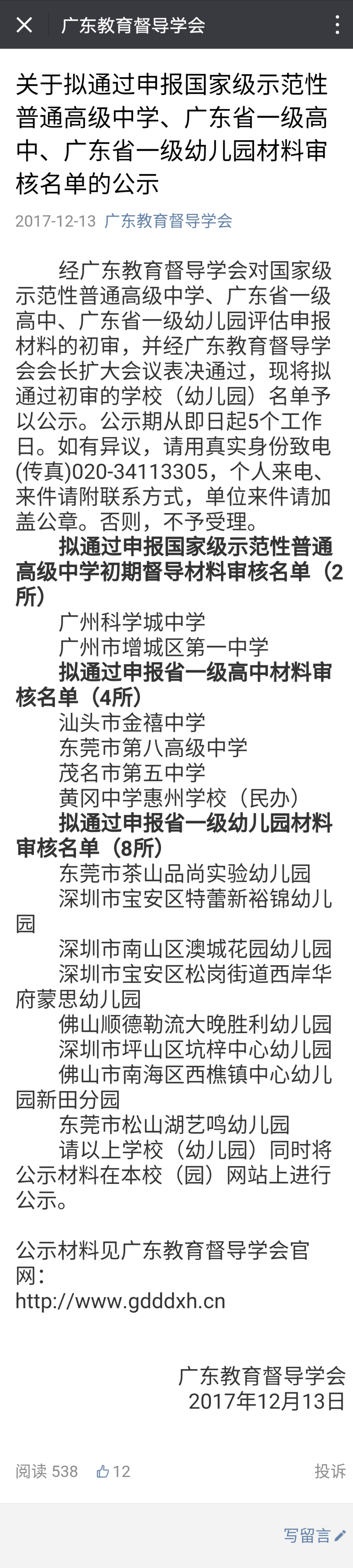 通知:关于拟通过申报国家级示范性普通高级中学、广东省一级高中、广东省一级幼儿园材料审核名单的公示