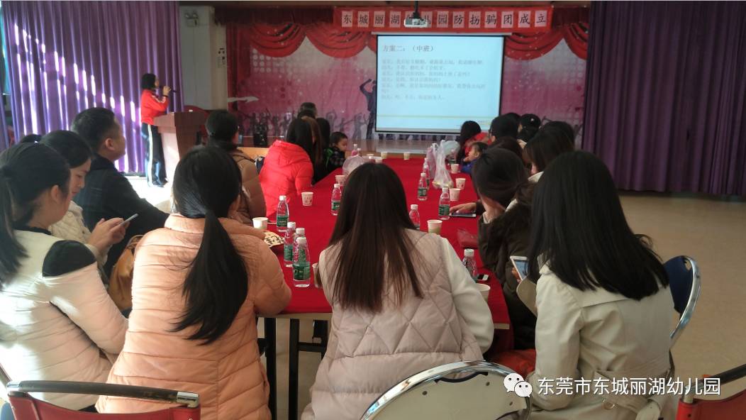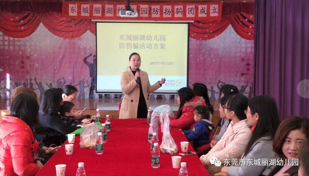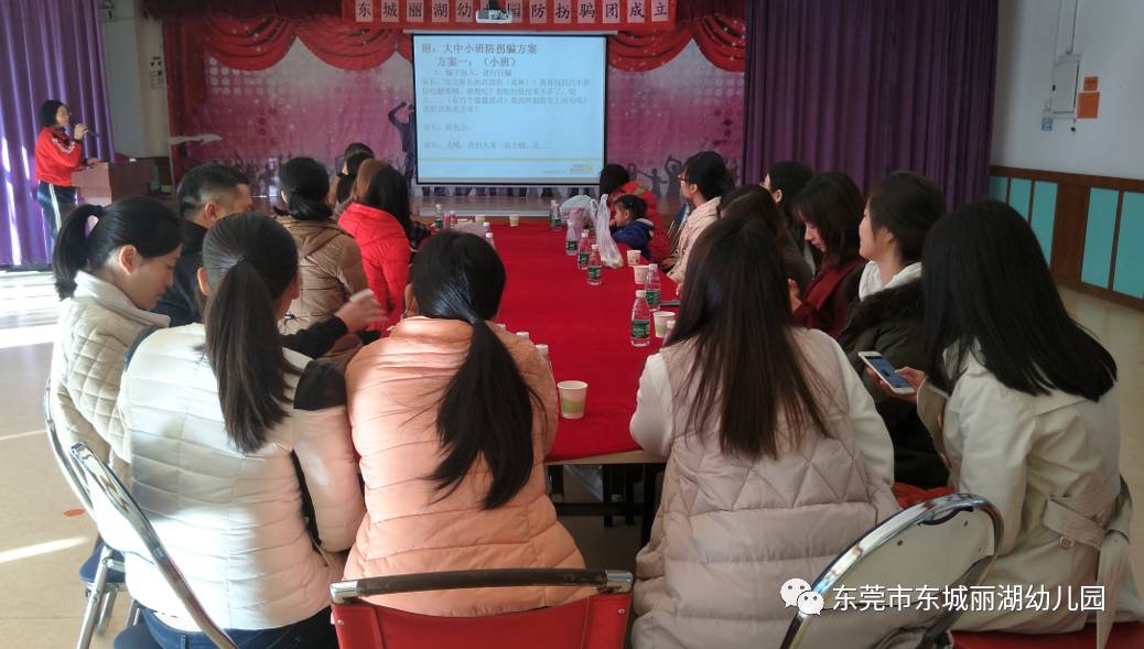 为了进一步增强家长和老师的安全教育和提高幼儿的安全防范意识及自我保护能力,近年幼儿被冒领、绑架、拐骗等事件频频发生,作为幼儿园我们必须做好安全防范工作,一方面要鼓励孩子学会交往,另一方面要教会孩子学会自我保护,提高应对突发事件的能力。让家长深入到我园教育中做到家园共育。在2017年12月20日,东城丽湖幼儿园组织全体师生、22名家长志愿者开展了一场“园内防拐骗演练”安全教育活动。 活动前,幼儿园召开了班主任会议,讲明活动的重要性,要求班级老师不做任何语言提示,静观孩子们的表现并进行记录。班级招聘“拐骗志愿者”。防拐骗活动分为三个阶段进行:第一阶段:9:00~9:30分,幼儿园安全主任陈老师组织家长召开了“拐骗团成立”,向家长阐述幼儿园开展“防拐骗演练”活动方案,观看《孩子们温馨的照片》和观看《救助流浪儿童的视频—我想回家》。