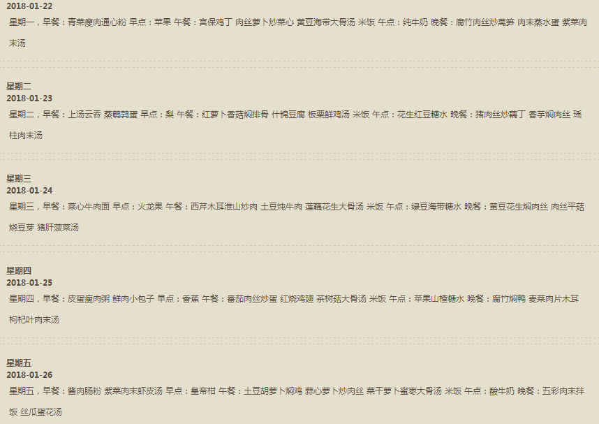 乐恩幼儿园2018.1.22-1.26一周食谱