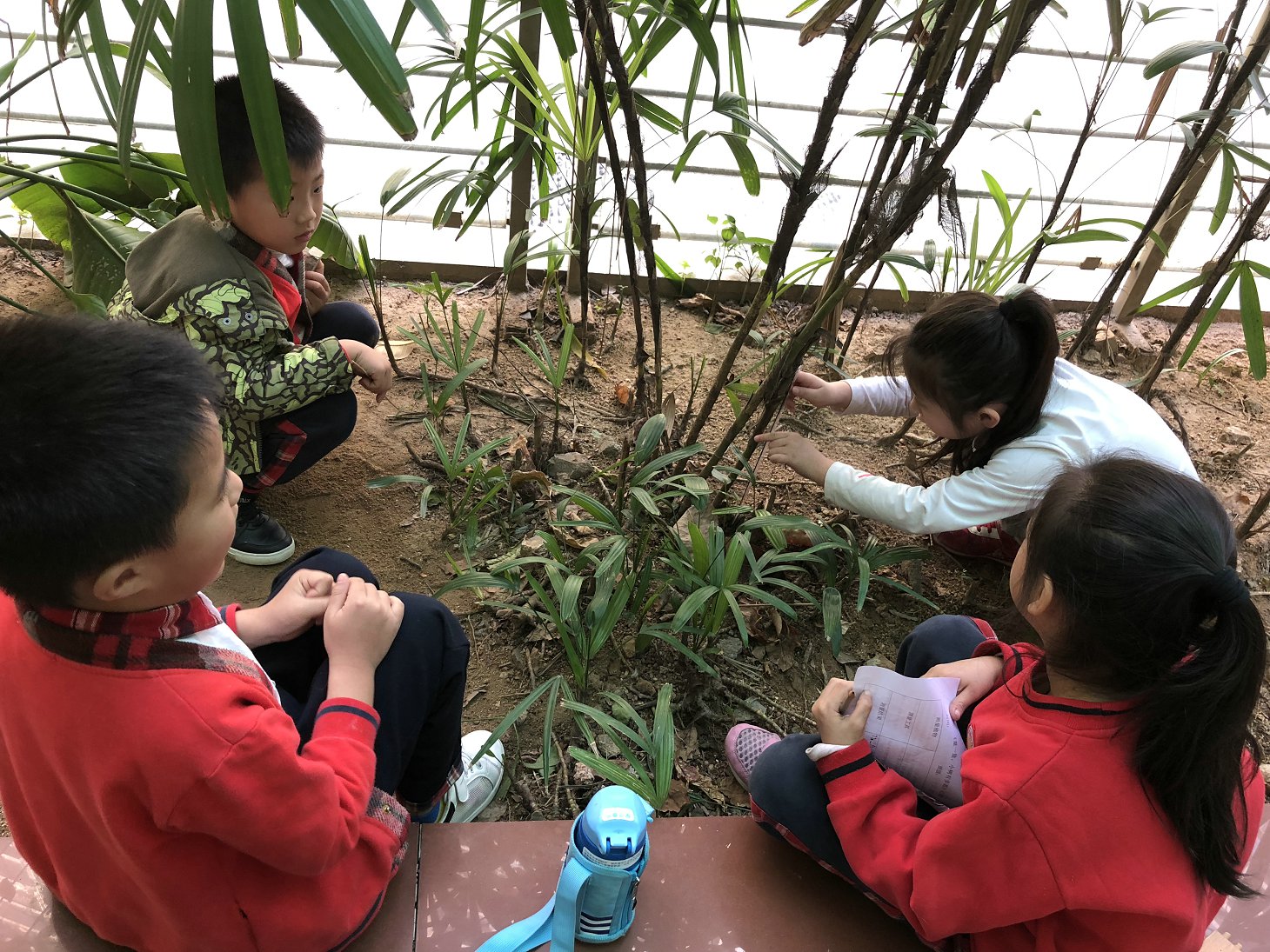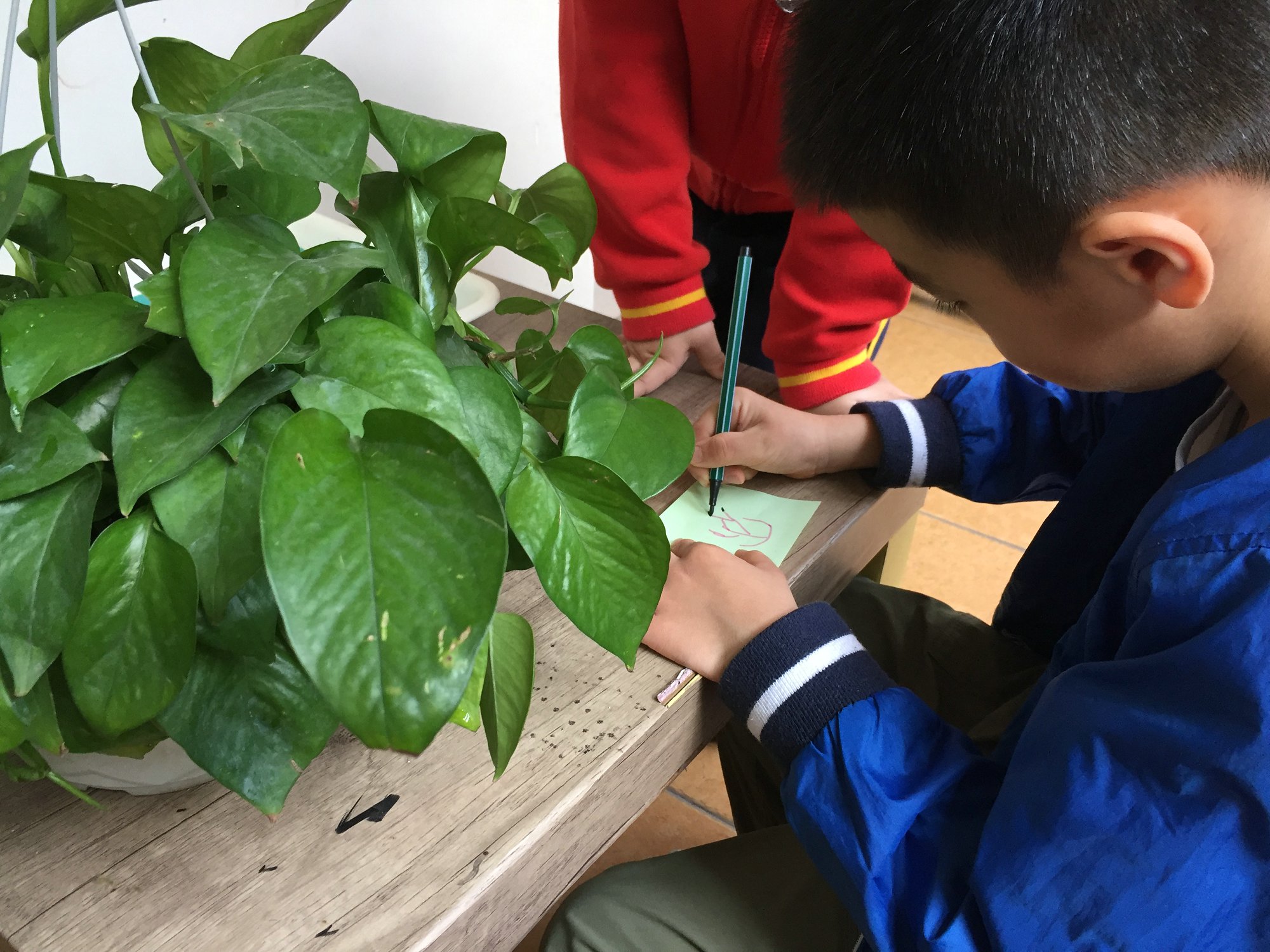 老师给幼儿普及一般什么时候适合给小树浇水,可用什么水浇水,比如:洗完菜的水、淘米水等、松土的时候怎样铲土才不会伤到树根等,随后幼儿自由成组,负责照顾一颗植物,定期浇水、松土。在老师的帮助下对班级所有植物进行分类,讨论为植物命名,制作标签牌子,挂牌合影。