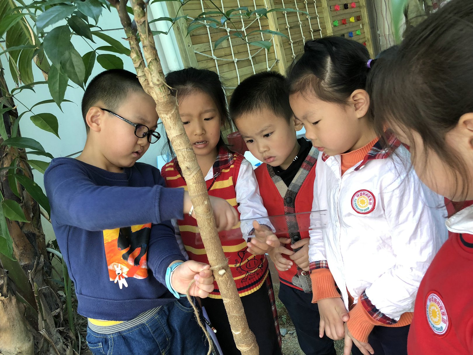 教师向小朋友讲解护绿爱树的重要性,幼儿分组领取一份记录单,组内幼儿讨论分工,用什么工具测量(尺子、书本、积木、卷尺)等,大家相互帮助,共同完成测量一颗植物(多高多宽等),测量小树苗的高度,记录小树的成长过程,与小树集体合影。