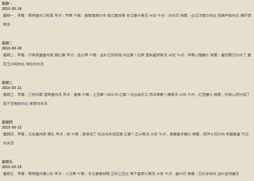 乐恩幼儿园2018.3.19-3.23一周食谱