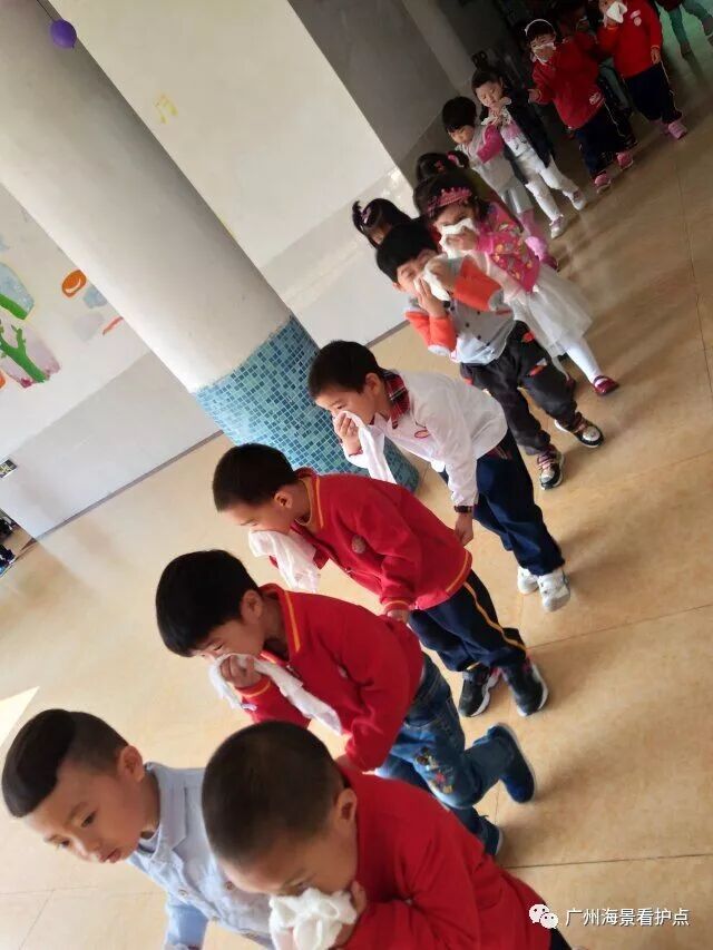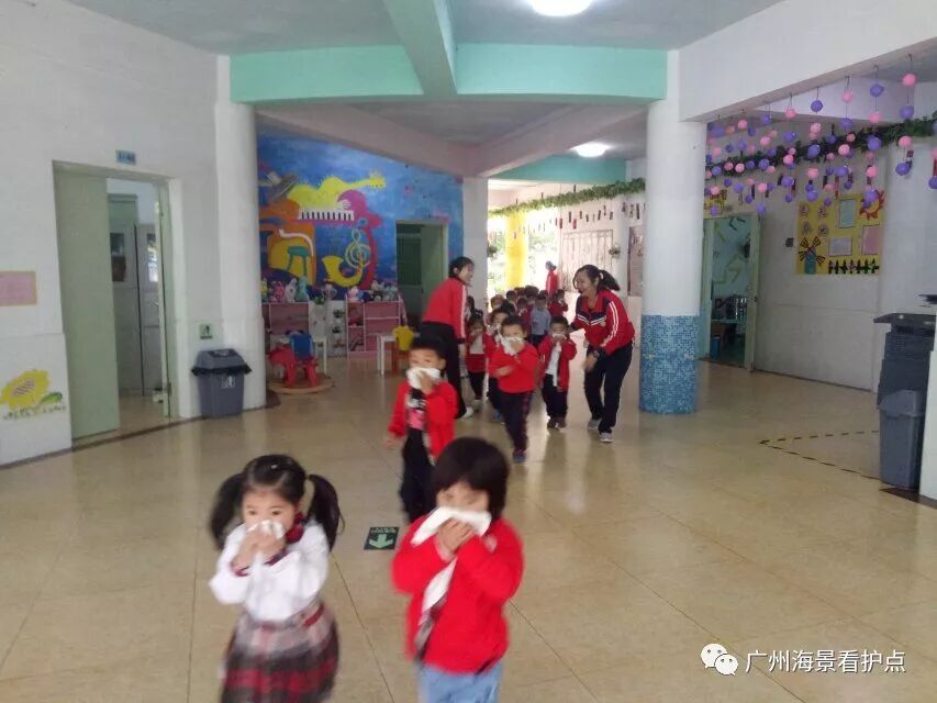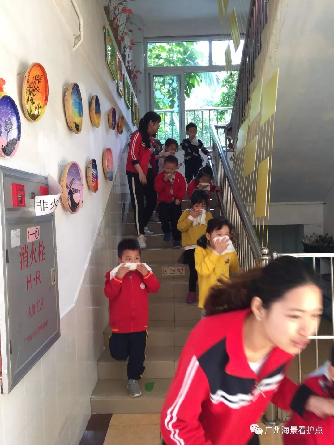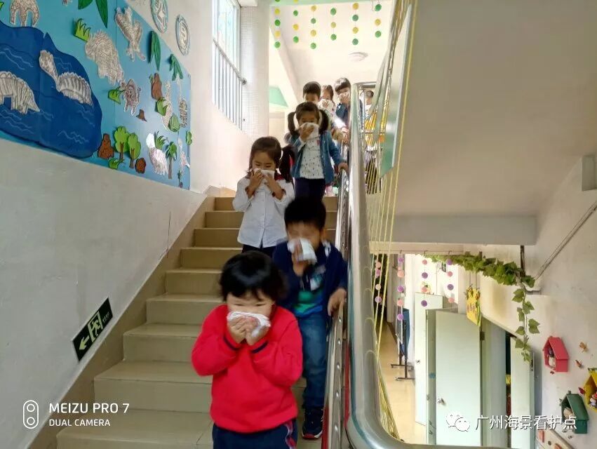 上午9:30随着急速的消防警报声,每个班级的幼儿在老师的组织下迅速排队,用湿毛巾捂住口鼻,弯着腰,手扶楼梯的栏杆,不吵不闹,紧张而有序的一个接一个,按照本班的疏散路线有秩序地撤离。