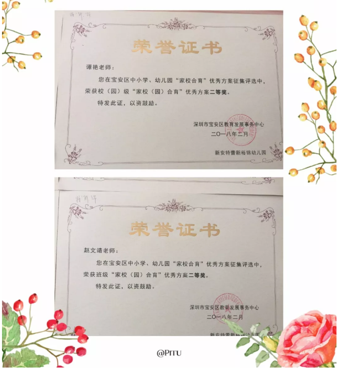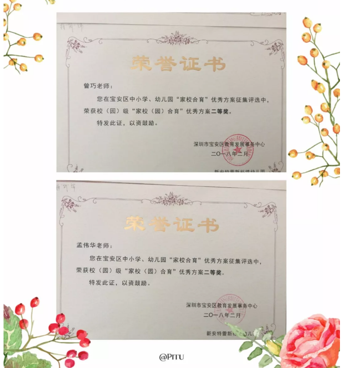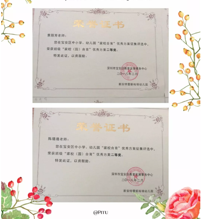2018年4月3日,我园在宝安区中小学、幼儿园“家校合育”优秀方案征集评选中,我园的谭艳、曾巧、袁丽芳、陈璐璐、赵文靖、孟伟华六位老师荣获校(园)级“家校(园)合育”优秀方案二等奖。特向全园师生报喜,并向以上获奖老师表示祝贺。