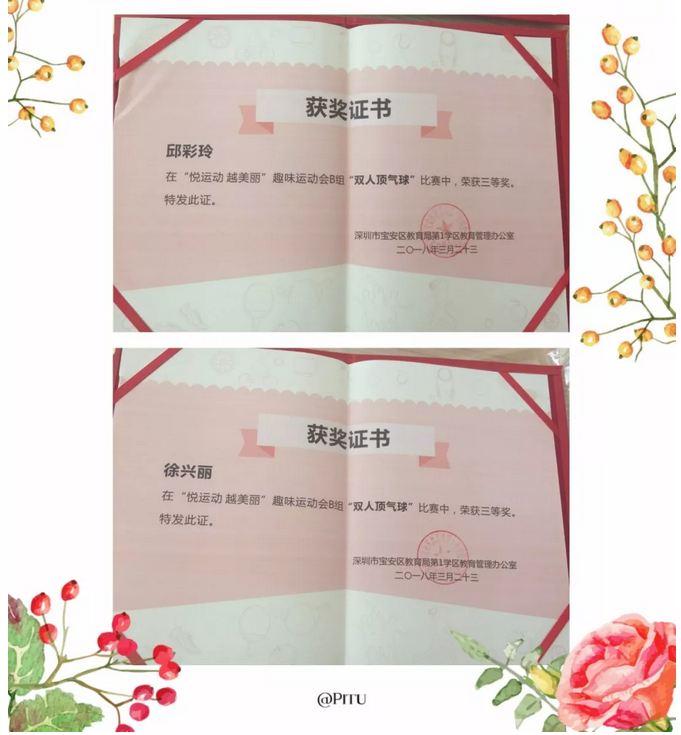 另,我园徐兴丽、邱彩玲老师在第一学区教育办“悦运动、悦美丽”三八妇女节趣味于运动会比赛中,荣获“双人顶气球”的三等奖。