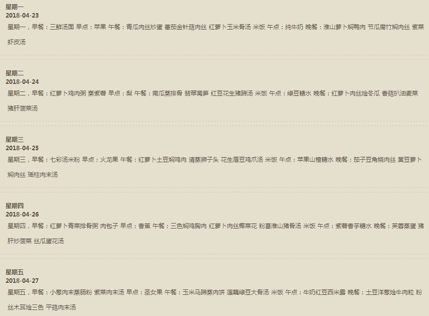 乐恩幼儿园2018.4.23-4.28一周食谱