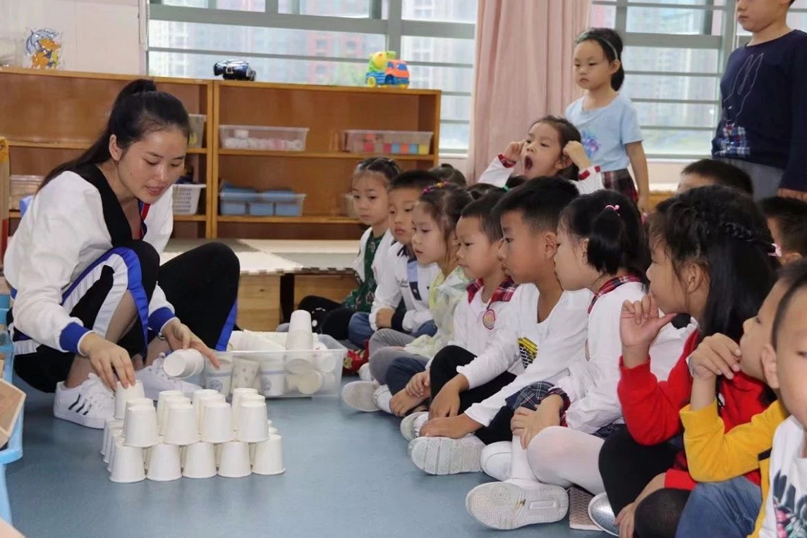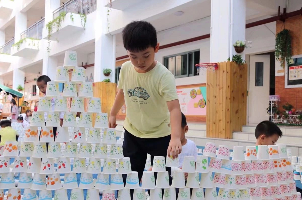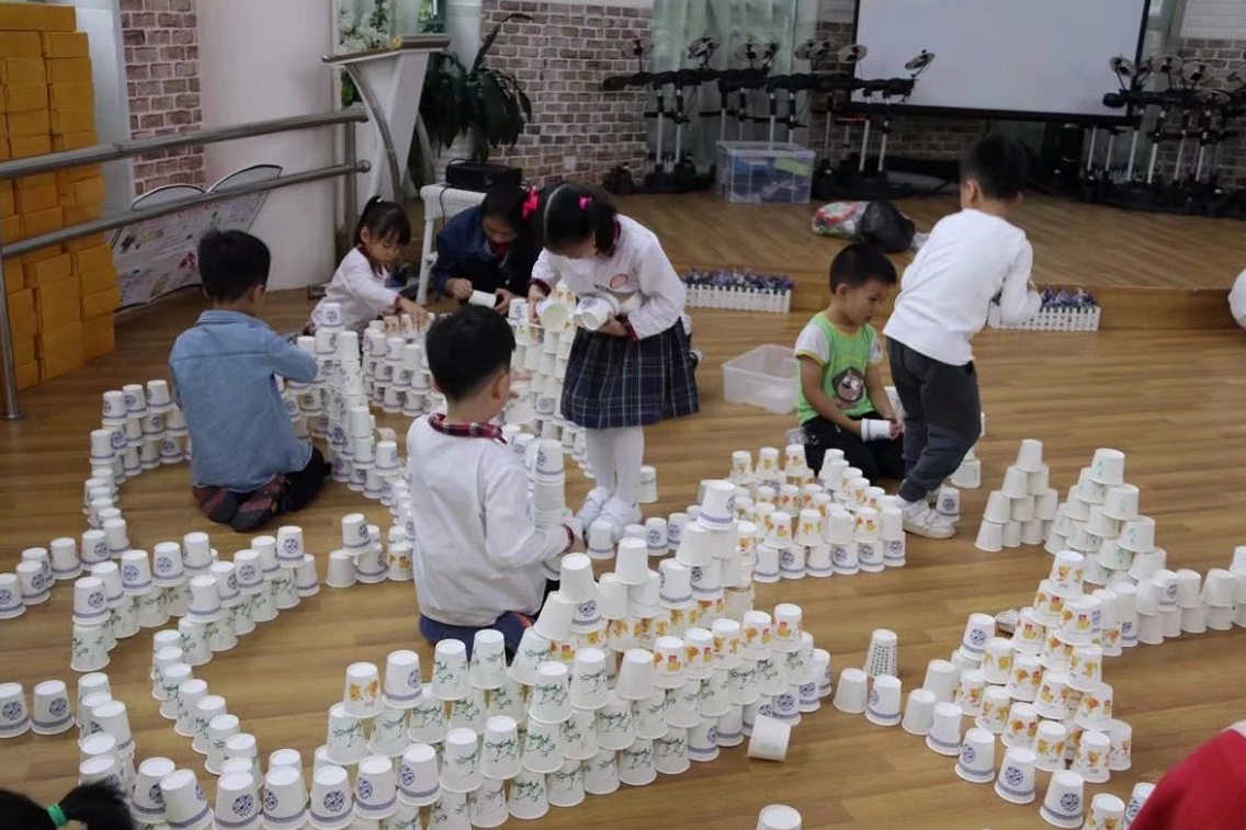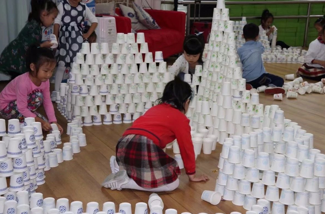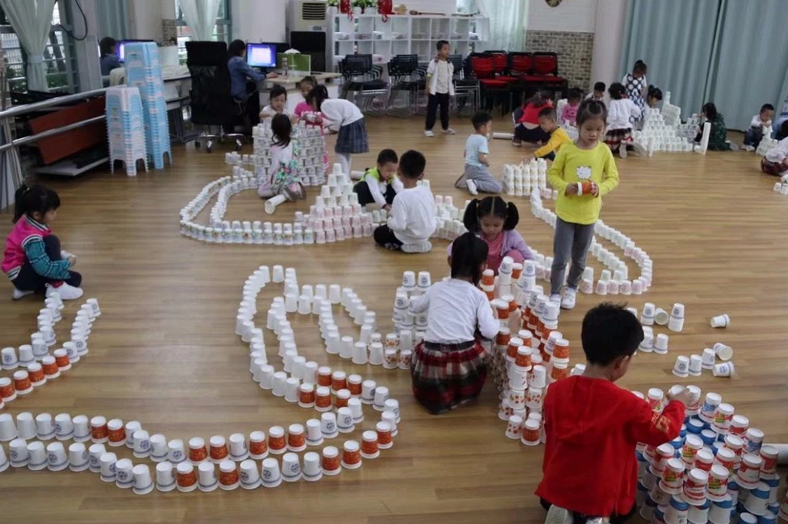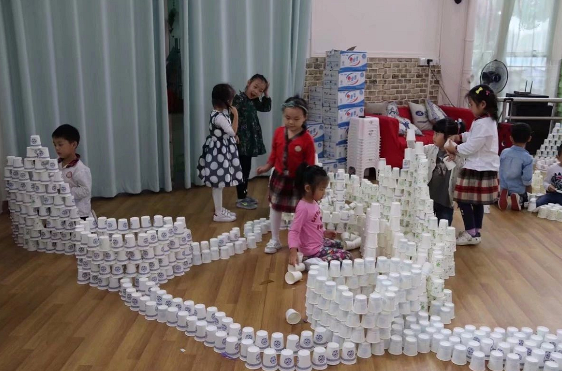 在孩子进行纸杯游戏时,老师只是作为孩子的引导者、观察者,并记录孩子们游戏时的情况,如:为什么用纸杯搭建容易倒?用积木搭建不容易倒?为什么?怎样保护用纸杯搭建的作品?以帮助孩子进一步了解纸杯的特性及搭建作品容易倒的原因,探讨解决问题的方法。