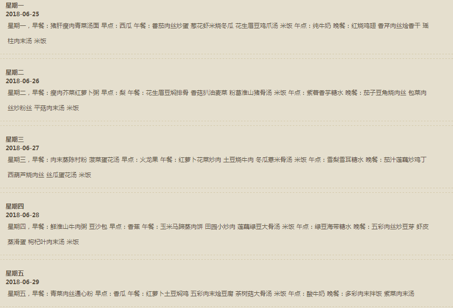 乐恩幼儿园2018.6.25-6.29一周食谱