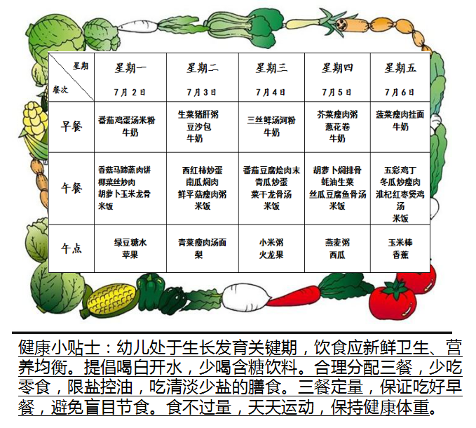 特蕾新裕锦幼儿园第十九周幼儿食谱